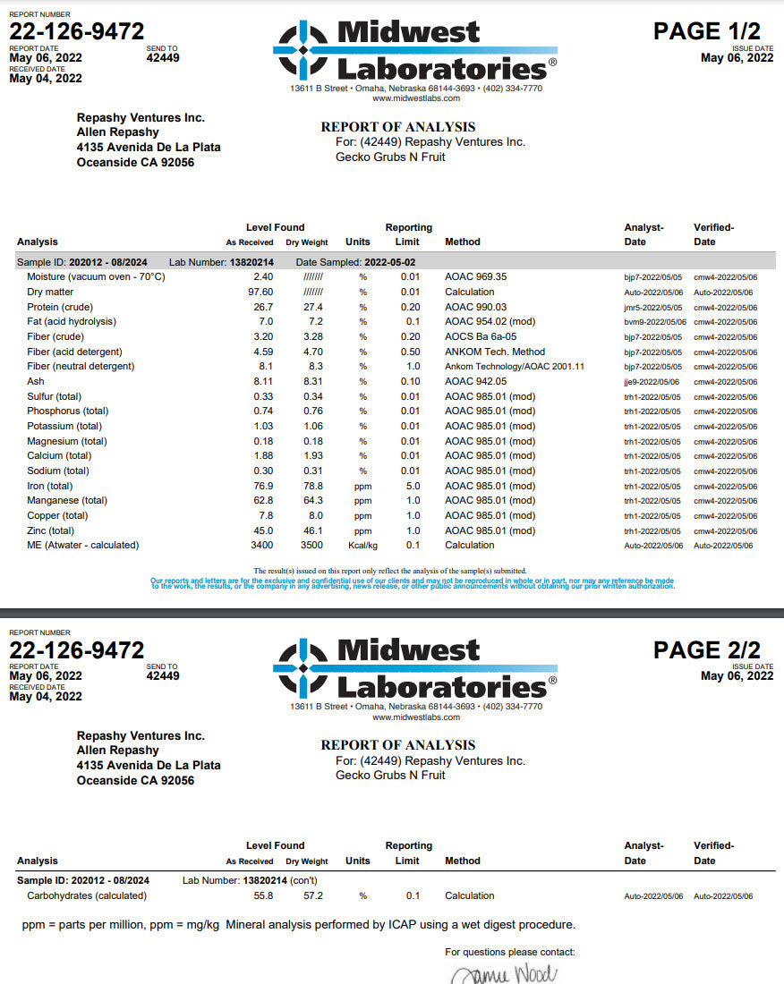 Grubs ‘N’ Fruit will make a great addition to our line of Gecko Diets. It is not designed to replace our Crested Gecko MRP, but rather to compliment it. Certain species, or individual animals, may prefer it over the standard formula. Grubs ‘N’ Fruit adds variety to the available food options, and provides the most natural source available of proteins, fats, chitin, and other essential nutrients for insect loving species. This new formula marks the introduction of our Insect Protein Powder into the Repashy line. We are currently developing, and will soon introduce, several other food products that feature this novel ingredient.